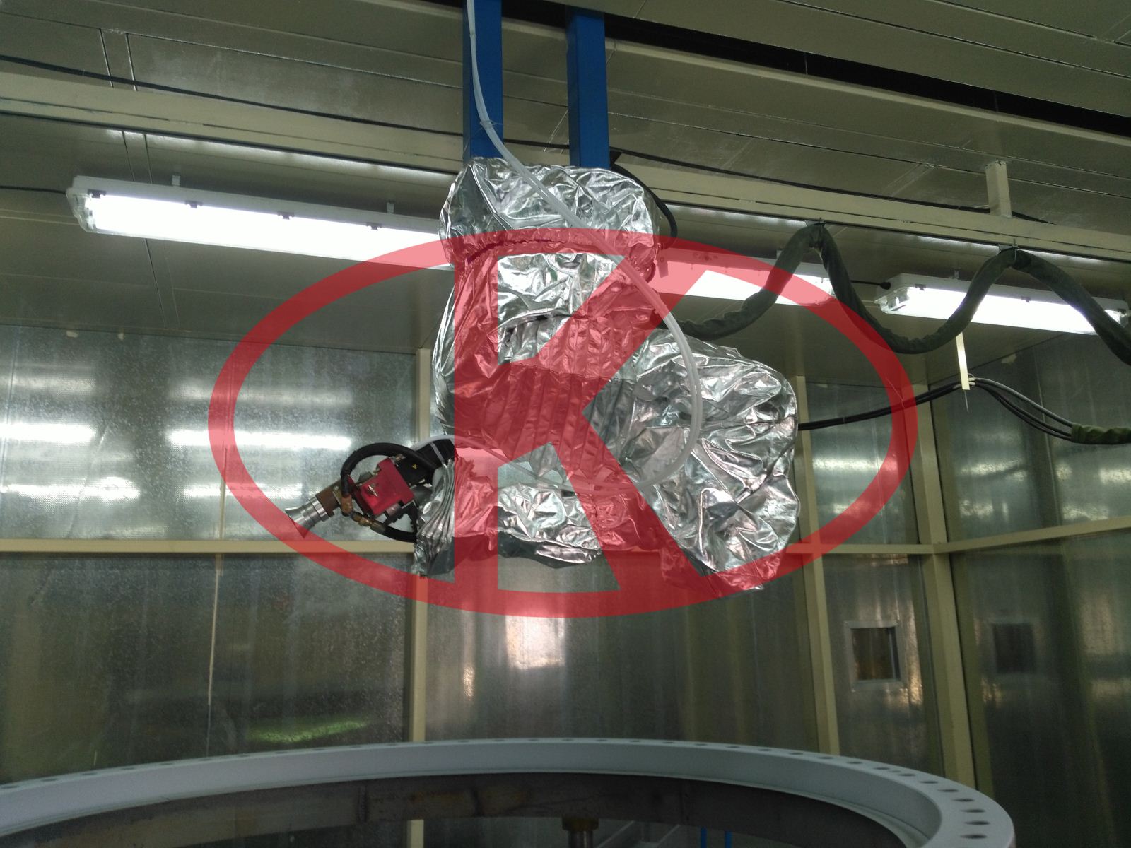 該套機器人自動噴鋅系統(tǒng)主要用于風(fēng)電及船用大軸承表面噴鋅重防腐。該套機器人自動噴鋅系統(tǒng)具有自動化、高效率、運行穩(wěn)定、噴涂精度高、安全等優(yōu)點。實現(xiàn)高品質(zhì)噴鋅噴涂:噴涂機器人精確的按照軌跡進行噴涂,無偏移并完美的控制噴槍啟動;確保在最短時間內(nèi)達(dá)到指定的噴涂厚度,并把偏差量控制在最小。