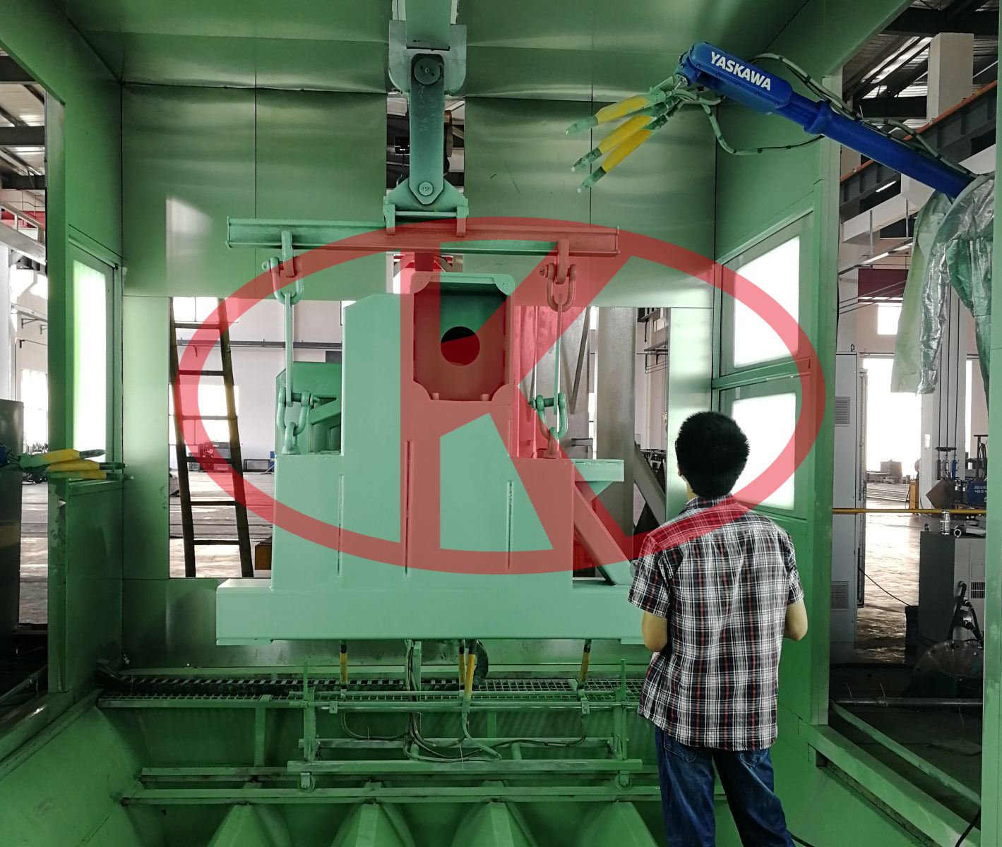 紡織機械大型機床床身懸掛自動拋丸機器人噴粉生產(chǎn)線