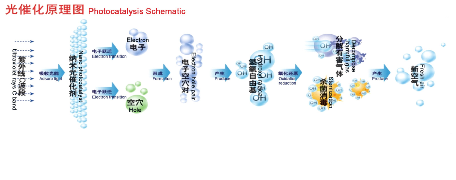 降解有機廢氣機理:活性自由基·OH、·O 等具有極強的氧化能力,可氧化分解各種有機化合物和部分無機物,能破壞細(xì)菌的細(xì)胞膜和固化病毒的蛋白質(zhì),可殺滅細(xì)菌和分解有機污染物,把有機污染物分解成無污染的水(H2O)和二氧化碳(CO2),因而具有極強的殺菌、除臭、防霉、防污自潔、凈化空氣功能。
