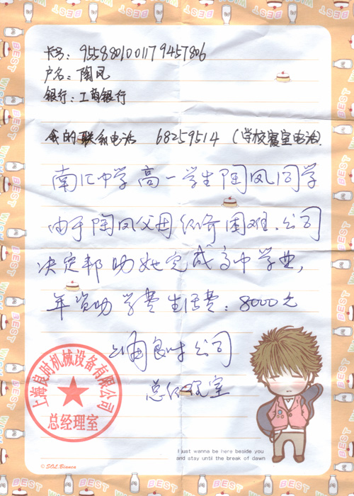 南匯中學(xué)高一學(xué)生陶鳳同學(xué),由于陶鳳父母經(jīng)濟困難,公司決定幫助她完成高中學(xué)業(yè),年資助學(xué)費生活費捌仟元整