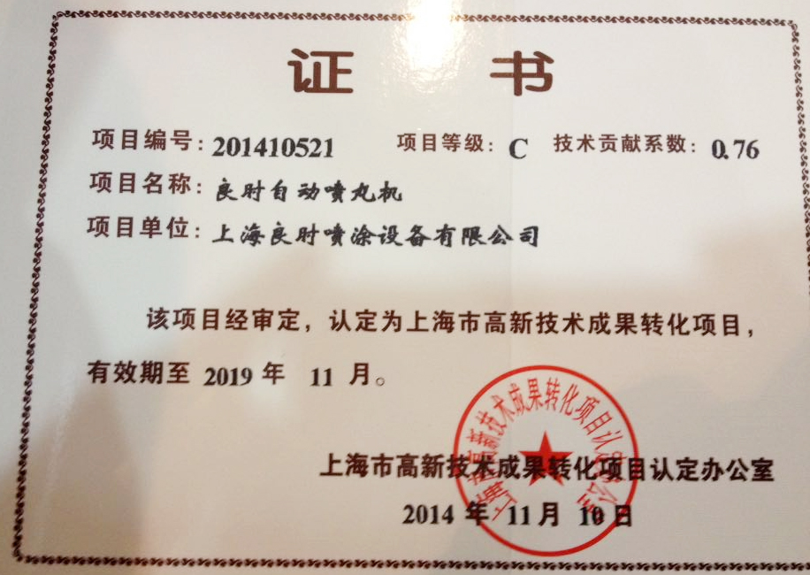 上海良時(shí)噴涂設(shè)備有限公司生產(chǎn)的“良時(shí)自動(dòng)噴丸機(jī)”通過審核認(rèn)定,成為2014年第10批上海市高新技術(shù)成果轉(zhuǎn)化項(xiàng)目。