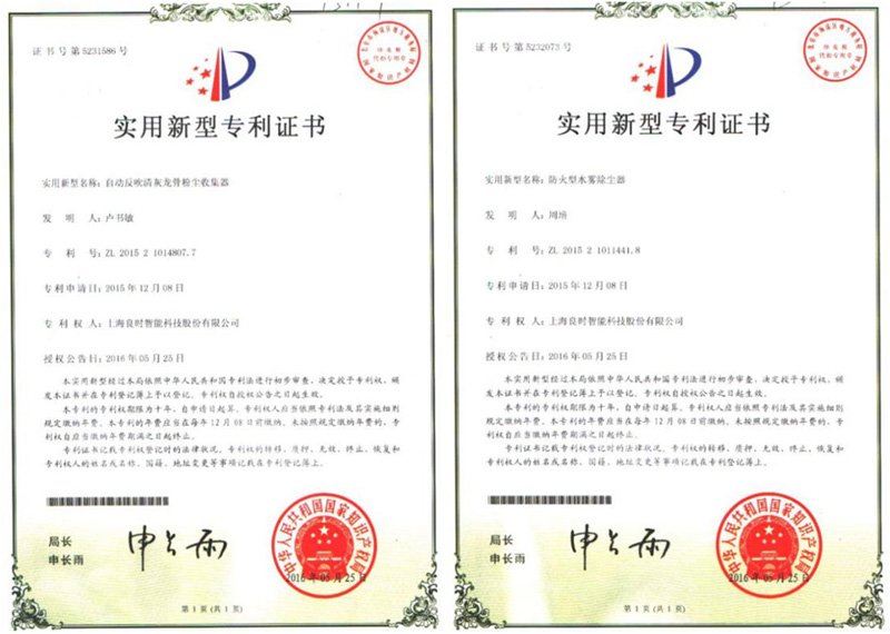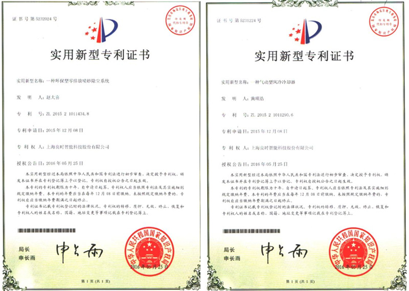 四項專利分別是“一種氣動型風冷冷卻器”、“自動反吹清灰龍骨粉塵收集器”、“防火型水霧除塵器”、“一種環(huán)保型零排放噴砂除塵系統(tǒng)”。