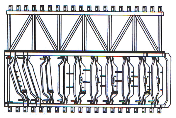 由于機(jī)床上、下橫梁有一定彈性,使它們可以同時(shí)承受立柱的重力。立柱在受到機(jī)床上橫梁向上拉力的同時(shí),也受到下橫梁對它向上的支撐力。這樣立柱的重力就被分散到上下橫梁上,減小了機(jī)床框架的變形。長壁-015為例來說,除4肋位之前的立柱禾24肋的立柱為斜立柱外,其余立柱都與機(jī)床框架水平面垂直,作為別承力立柱使用(見圖6)。