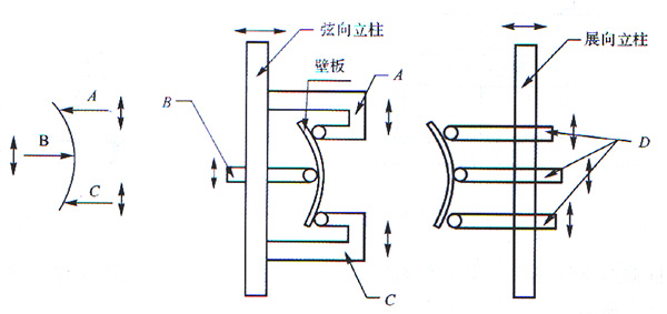 在展向彎曲比較大的1到11肋位使用展向立柱,在這14根弦向立柱上下兩邊各開了2個(gè)和展向立柱連接的M30的螺栓孔,4根展向立柱和它們配合使用。
