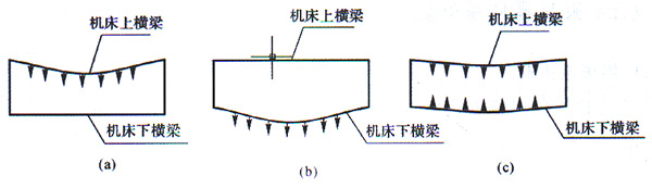 夾具總設(shè)計(jì)重量近2t,為防止夾具的重力全部作用到機(jī)床上橫梁或者下橫梁上,使其產(chǎn)生嚴(yán)重的凹曲變形(見圖5(a)和圖5(b)),為了把夾具的重力均勻分散到上、下橫梁上(見圖5(c)),將立柱兩端禾滑軌安裝配合的孔間距做到和上下滑軌孔間距相同。