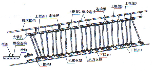 由于加工的零件長短大小不一,長達(dá)12m多,夾具體總長也近14m??紤]到整個(gè)工裝禾機(jī)床的強(qiáng)度、剛性、重量、制造的可行性,夾具是用槽鋼、方鋼焊接成的3個(gè)上框架和3個(gè)下框架構(gòu)成的??蚣芎炭蚣苤g用鋼板通過螺栓連接起來。上下框架又通過螺栓和機(jī)床連接,夾具體裝卸靈活,方便。機(jī)床框架帶有若干Φ15mm的孔,使夾具和機(jī)床框架完全成為一體。上、下框架橫梁上按肋位打有和滑軌安裝的孔,它們的裝配也是通過螺栓螺母完成的。