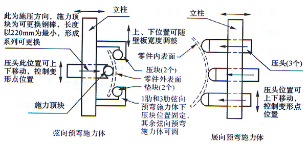 (11)要求展向預(yù)彎施體3個(gè)壓頭和弦向展向預(yù)彎施力體的壓頭為弓形夾形式,可沿支柱上下位置連續(xù)可調(diào),可以互換。