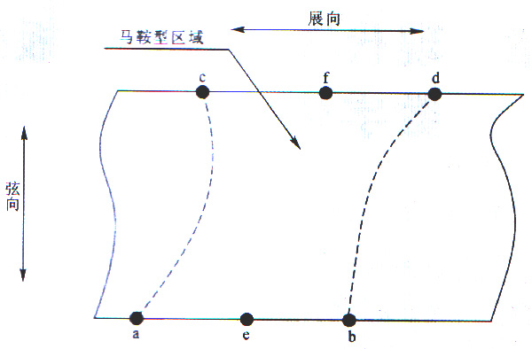 大型壁板上馬鞍型區(qū)域外形曲率的兩個(gè)主曲率為異號(hào),在其展向兩側(cè)區(qū)應(yīng)存在展向曲率從凹變凸發(fā)生改變的邊界點(diǎn),并且有展向彎曲半徑小的凹點(diǎn)。參照圖7所示,a,b,c和d四點(diǎn)為典型馬鞍型區(qū)域在機(jī)翼壁板展向外形面兩邊沿的邊界點(diǎn),e為ab線上主極小曲率值(即展向曲率)大點(diǎn),f為cd線上主極小曲率值點(diǎn),由此得到展向預(yù)彎時(shí)線ac,ef和bd構(gòu)成展向三點(diǎn)預(yù)彎位置,其中ac和bd為支點(diǎn)位置,ef為壓點(diǎn)位置。