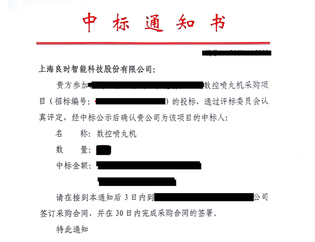 半年伊始,捷報(bào)頻傳!近日,上海良時(shí)智能科技股份有限公司(股票代碼:837430 厚積薄發(fā) 持續(xù)創(chuàng)新)成功中標(biāo)國內(nèi)某齒輪廠重卡汽車后橋齒輪機(jī)器人上下件數(shù)控噴丸機(jī)(數(shù)控強(qiáng)力噴丸機(jī))采購招標(biāo)項(xiàng)目(用于商用車螺旋錐齒輪副、圓柱齒輪及端面結(jié)合齒的齒根等的噴丸強(qiáng)化處理)。