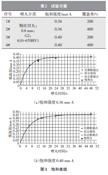 試驗使用壓縮空氣式噴丸機,由于試驗條件限制,無法驗證噴丸介質(zhì)屬性(材質(zhì)、大小、硬度)的影響,故試驗中噴丸介質(zhì)屬性為常量,只驗證飽和強度和覆蓋率對噴丸后齒面粗糙度的影響,試驗方案見表2。具體試驗參數(shù)的確定過程如下:通過Almen試片試驗繪制飽和曲線(圖3),確定飽和 點,從而鎖定壓縮空氣壓力、鋼丸流量、噴嘴移動速度、噴嘴距零件距離等設(shè)備參數(shù)。