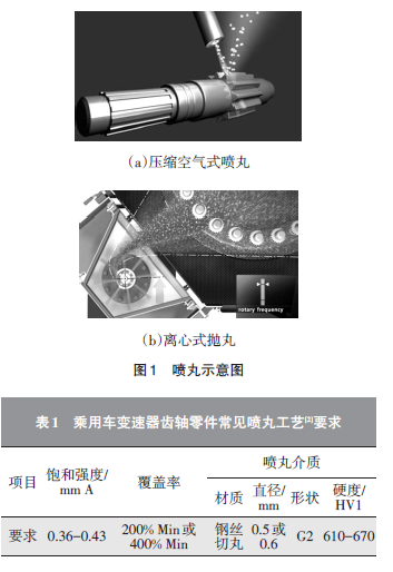 壓縮空氣式噴丸以壓縮空氣作為動力,將彈丸從噴槍噴出;離心式拋丸用電機帶動葉輪高速旋轉(zhuǎn),將彈丸拋擲出去。噴丸的關(guān)鍵工藝參數(shù)包括飽和強度、覆蓋率和噴丸介質(zhì)屬性(材質(zhì)、尺寸、形狀、硬度)。飽和強度是表征噴丸強度的參數(shù),用弧高值(即Almen 試片噴丸后的彎曲程度)表示;覆蓋率指噴丸后被凹坑覆蓋面積與噴丸區(qū)域總面積的比值;常用噴丸介質(zhì)有鋼絲切丸、鑄鋼丸、陶瓷丸、玻璃丸等,其尺寸、形狀、硬度均有不同的等級。變速器齒軸零件通常的工藝要求如表1所示。