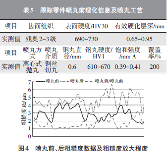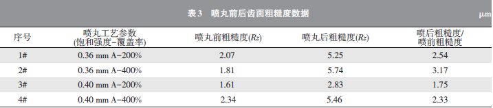 a.優(yōu)化噴丸工藝參數(shù),在保證殘余壓應(yīng)力的前 提下,控制噴丸后齒面粗糙度放大程度。這需要大量的工藝試驗,且工藝通用性不強。