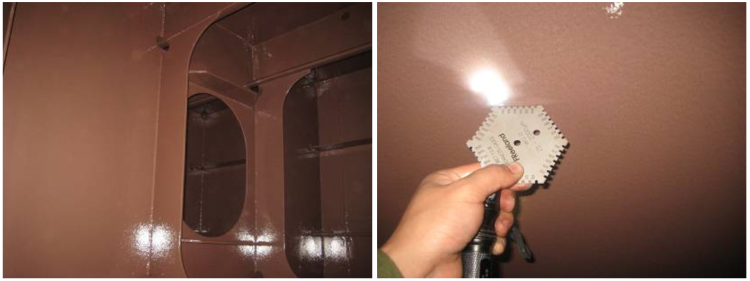 當(dāng)評估后,對大接縫為St 3,或更好,或可行時(shí)為Sa 2½。小破壞面積的總和不大于總面積的2%時(shí)為St3。相鄰接的涂層損壞總面積超過25 ㎡或超過艙室總面積2%, 應(yīng)為Sa2½。