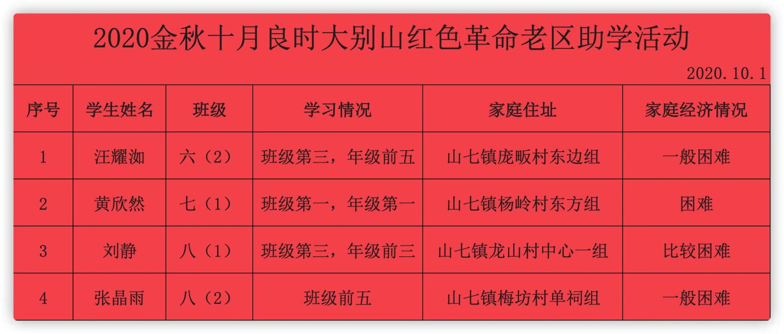 2020年注定是不平凡的一年,因?yàn)橐咔榈仍驅(qū)е鹿就聼o(wú)法集體前往大別山革命老區(qū)進(jìn)行助學(xué)活動(dòng)。即使這樣,上海良時(shí)智能(股票代碼:837430 厚積薄發(fā) 持續(xù)創(chuàng)新)還是決定派遣良時(shí)青年突擊隊(duì)愛(ài)心特使在國(guó)慶假期期間前往大別山紅色革命老區(qū)繼續(xù)著良時(shí)國(guó)慶公益慈善活動(dòng)!良時(shí)20多年堅(jiān)持大別山紅色老區(qū)助學(xué)之旅,創(chuàng)造價(jià)值,回報(bào)社會(huì),初心不變!