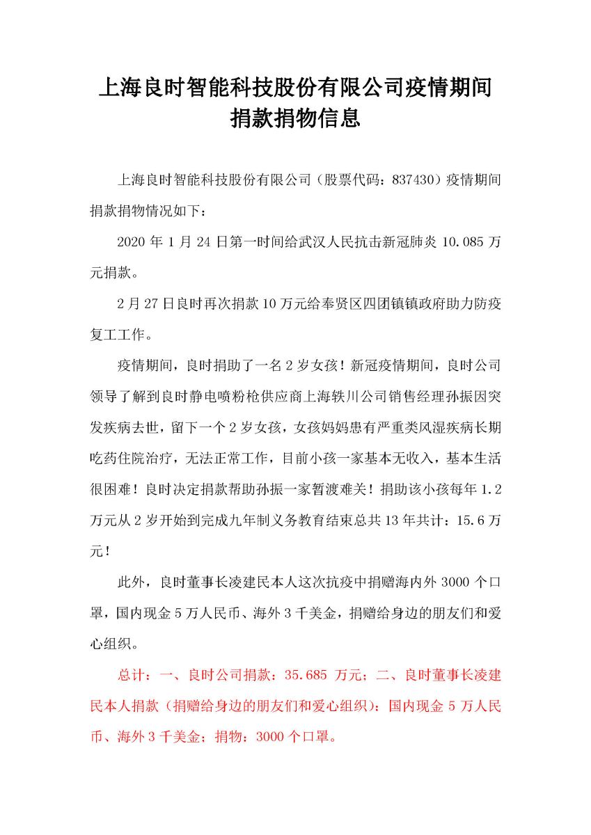 自新冠肺炎疫情發(fā)生以來,上海良時積極響應(yīng)黨和政府號召,以“生命重于泰山,疫情就是命令,防控就是責(zé)任”的高度責(zé)任心和使命感,主動擔(dān)當(dāng)作為,迎難逆行而上,大愛無疆,慷慨解囊,不遺余力捐款捐物,充分展現(xiàn)了良時人的社會責(zé)任和使命擔(dān)當(dāng)。