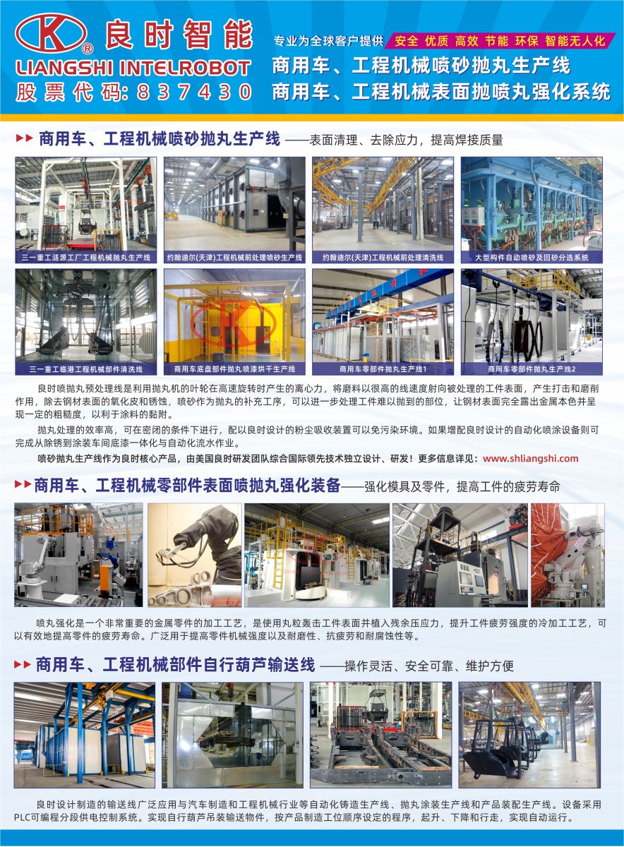 上海良時(shí)專業(yè)為全球客戶提供商用車、工程機(jī)械噴砂拋丸生產(chǎn)線;商用車、工程機(jī)械表面噴丸強(qiáng)化系統(tǒng)。噴砂拋丸生產(chǎn)線作為良時(shí)核心產(chǎn)品,由美國良時(shí)研發(fā)團(tuán)隊(duì)綜合國際領(lǐng)先技術(shù)獨(dú)立設(shè)計(jì)、研發(fā)!