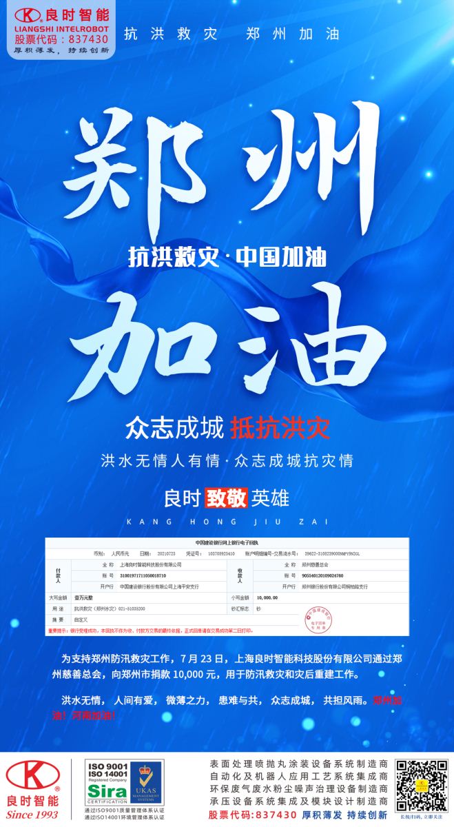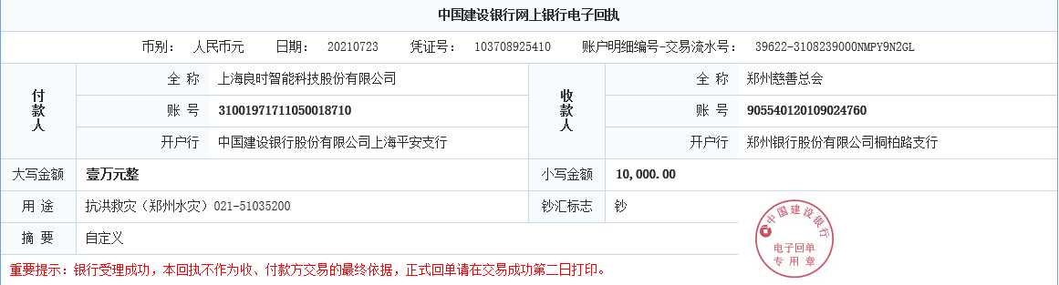 良時(shí)給鄭州人民帶去一絲溫暖,為支持鄭州防汛救災(zāi)工作,7月23日,上海良時(shí)智能科技股份有限公司通過鄭州慈善總會(huì),向鄭州市捐款10,000元,用于防汛救災(zāi)和災(zāi)后重建工作。