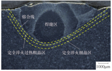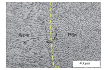 30CrMnSiNi2A鋼TIG焊修復(fù)接頭的形貌如圖4所示,接頭由焊縫區(qū)、熔合線、熱影響區(qū)和母材區(qū)組成。接頭微觀組織如圖5所示。焊縫中心主要為粗大等軸晶,靠近熔合線的焊縫區(qū)主要由柱狀晶構(gòu)成。這是因為熔融的填充金屬首先從熔合線開始凝固,由于冷卻速度較快,過冷度較大,容易生成柱狀晶,焊縫中心凝固速度變慢且過冷度減小,更容易生成等軸晶。焊縫金屬在冷卻過程中經(jīng)歷了固態(tài)相變,首先形成奧氏體和鐵素體組織,隨著溫度進一步下降,轉(zhuǎn)化為板條馬氏體和少量殘留奧氏體[5] 。