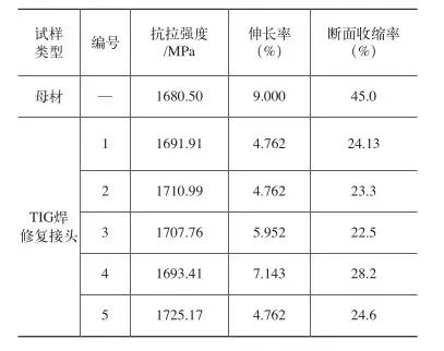 按照GB/T 228.1—2010《金屬材料室溫拉伸試驗方法》對30CrMnSiNi2A鋼的母材和TIG焊修復(fù)接頭進行常溫拉伸性能測試,結(jié)果見表2。30CrMnSiNi2A作為一種超高強度鋼,具備優(yōu)良的力學(xué)性能,但經(jīng)過TIG焊修復(fù)后接頭的各項力學(xué)性能變化較大:母材的抗拉強度為1680.50MPa,TIG焊修復(fù)接頭的抗拉強度平均值為1705.85MPa,比母材高1.5%,數(shù)值上與母材相當(dāng);TIG焊修復(fù)接頭的伸長率平均值為5.48%,比母材下降39.11%;TIG焊修復(fù)接頭的斷面收縮率平均值為24.55%,比母材下降45.44%。由此可知,TIG焊修復(fù)接頭的強度與母材相當(dāng),塑性指標(biāo)下降較嚴(yán)重。這是因為TIG焊修復(fù)接頭的焊縫組織主要由塑性較差的板條馬氏體構(gòu)成,而母材組織主要由細(xì)小均勻的針狀馬氏體和貝氏體構(gòu)成,母材塑性要強于焊縫。同時TIG焊修復(fù)接頭均斷于熱影響區(qū),這是因為熱影響區(qū)相比正常的母材區(qū)和焊縫區(qū),其強度最低。