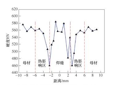 圖6 TIG焊修復(fù)接頭的顯微硬度分布曲線
