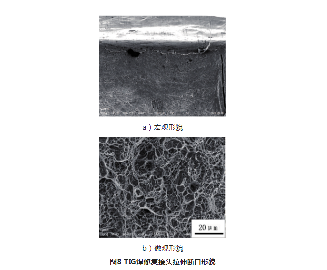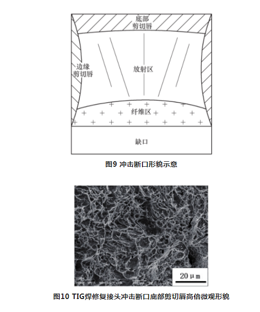 通過圖8b和圖10均可觀察到明顯韌窩和撕裂棱,圖8b顯示的等軸韌窩及圖10顯示的拉長韌窩和等軸韌窩在沖擊斷口中均占據(jù)一定比例。通過以上斷口的微觀觀察,可以判斷出TIG焊修復(fù)接頭的拉伸斷口和沖擊斷口均呈現(xiàn)塑性斷裂特征。