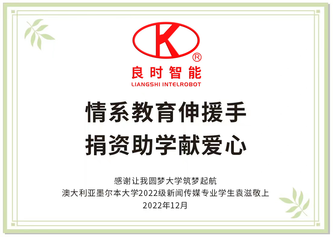 情系教育伸援手,捐資助學(xué)獻(xiàn)愛心。上海良時(shí)智能科技股份有限公司向袁同學(xué)提供資助,助其圓留學(xué)夢(mèng)。