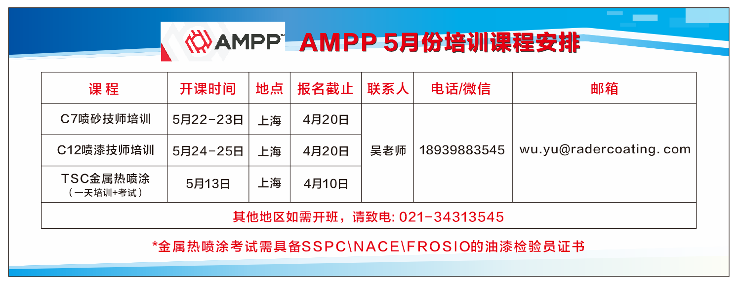 上海睿德、良時(shí)智能(股票代碼:837430)噴砂涂裝培訓(xùn)基地2023年培訓(xùn)課程正式開(kāi)始,報(bào)名通道已開(kāi)啟,此次培訓(xùn)課程將開(kāi)展AMPP SSPC 噴砂、噴漆技師培訓(xùn)及TSC 金屬熱噴涂檢驗(yàn)員培訓(xùn)。