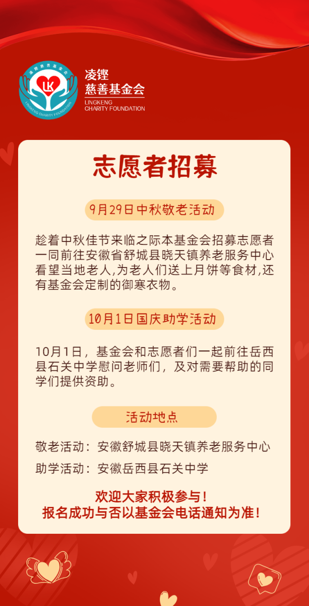 上海凌鏗慈善基金會十一小長假招募志愿者,歡迎大家踴躍參與!