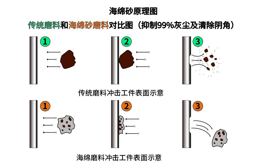 海綿磨料低塵噴砂系統(tǒng)的核心是海綿磨料 , 其本身具有低塵、低彈射性能。這種專利技術(shù)結(jié)合了聚氨酣海綿的吸收能力及傳統(tǒng)噴砂工藝的清潔磨削能力。海綿磨料的柔性使其在沖擊被處 理表面時(shí)變扁, 瞬間擴(kuò)張至實(shí)際尺寸的3 倍并形成真空, 將捕捉絕大多數(shù)經(jīng)沖擊后脫離表面的污染空氣的微粒、碎屑等物質(zhì), 令底材顯露出來。