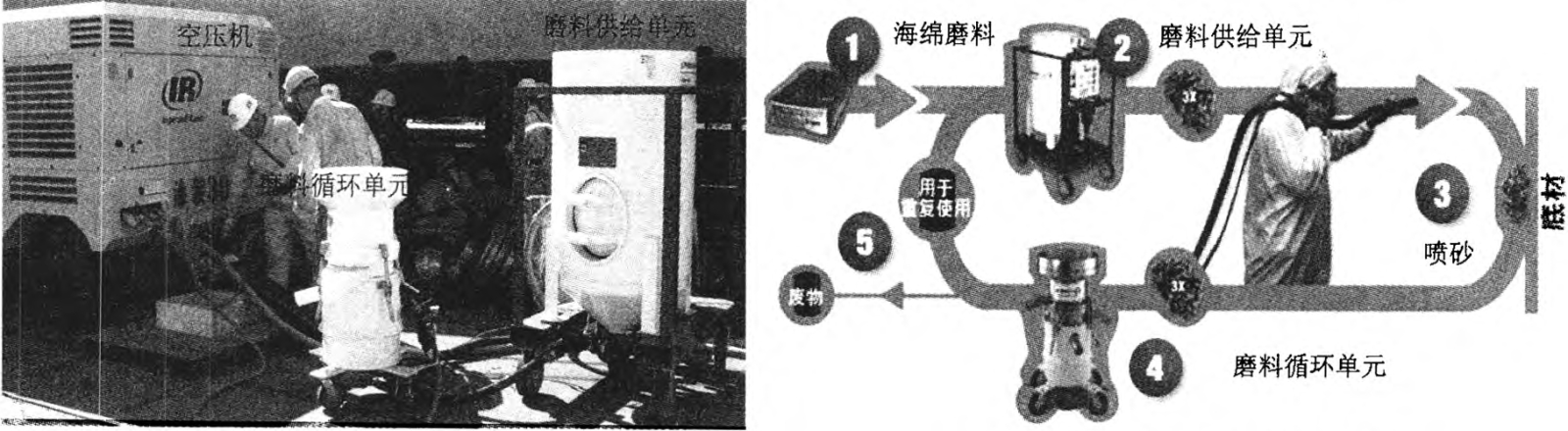 針對(duì)以上不利因素,業(yè)內(nèi)展開了大量細(xì)致的討論與研究,推出了一項(xiàng)新型除銹工藝—海綿磨料低塵噴砂工藝。該工藝采用了先進(jìn)的靈便型噴砂與回收組合套裝,并且將常規(guī)磨料升級(jí)為海綿磨料。