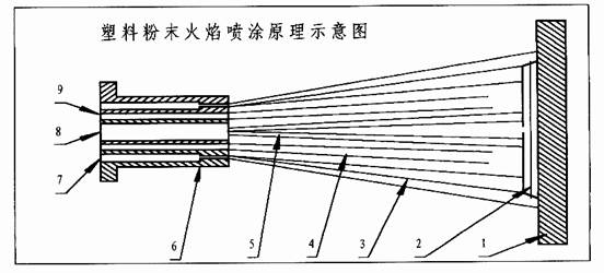 圖:塑料粉末融射噴涂設(shè)備形成致密涂層的原理 1噴涂工件;2噴涂涂層;3火焰焰流;4保護(hù)氣體流;5塑料粉末+氣體; 6噴嘴;7氧燃?xì)膺M(jìn)口;8粉末+氣體進(jìn)口;9冷卻和保護(hù)氣體進(jìn)口;