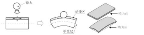 噴丸成形的基本原理是:利用高速彈丸(直徑1~6mm)流撞擊金屬板材的表面,使受撞擊的表面及其下層金屬材料產(chǎn)生塑性變形而延伸,從而逐步使板材發(fā)生向受噴面凸起的雙向彎曲變形(如圖所示)。